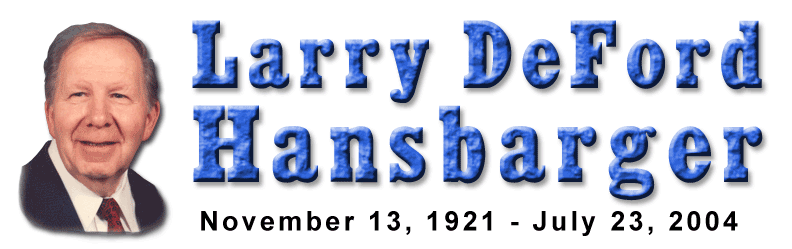 Larry DeFord Hansbarger, 82, passed away Friday, July 23, 2004. He was the beloved husband of Joan Arline (Beatty) Hansbarger for fifty-one years and loving father to: Mark Beatty Hansbarger of Lake James; Brian DeFord Hansbarger, Clear Lake; Alan Dean Hansbarger, Auburn; and Karen Elise (Hansbarger) Barrett and her husband John Brian Barrett of Clear Lake, Indiana. |
